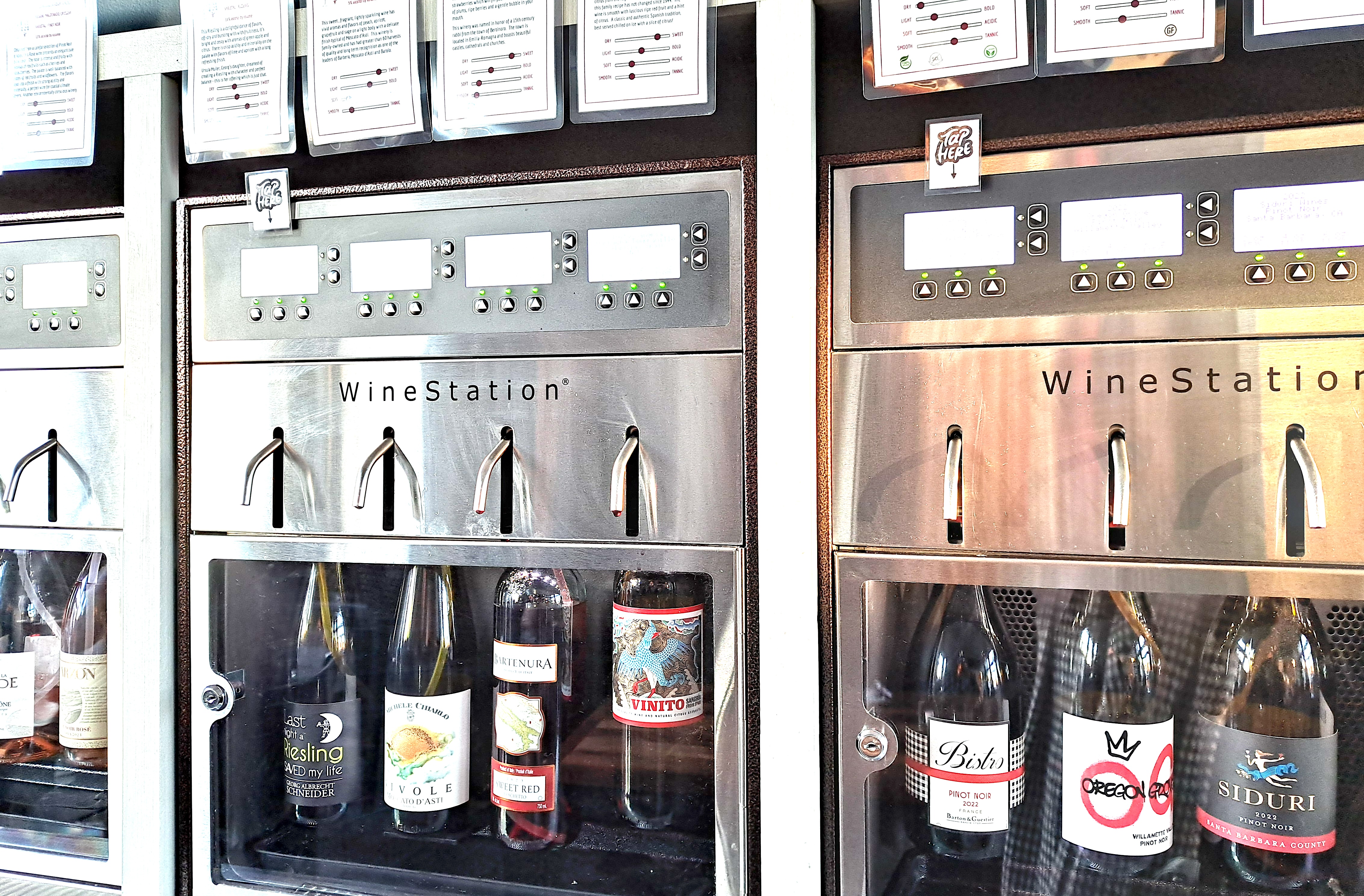 Uva is a self-service wine bar, a bit like the Automats of olden times. Like its Plymouth, MA sister bar, Uva Mashpee features 48 different wines via self-pour dispensers. Give your credit card to the greeter and start exploring. Feel like a glass of rosé? You’ve got two choices: a Grenache blend from Domaine de la Bastide, Cotes du Rhone, France [$2/oz] and a Pinot Noir from Bodega Garzon Reserve, Maldonado, Uruguay [$2.25/oz]. Bring your glass up to the nozzle, select a 2, 4, or 6 oz pour, and press “play.” Ready to spend big bucks for “Reserve Red?” Uva’s got four on tap, from the acclaimed Post & Beam Cab by Far Niente, Napa [$3.75/oz] to a pricey Isoceles red blend from Justin in Paso Robles [$5.63/oz].